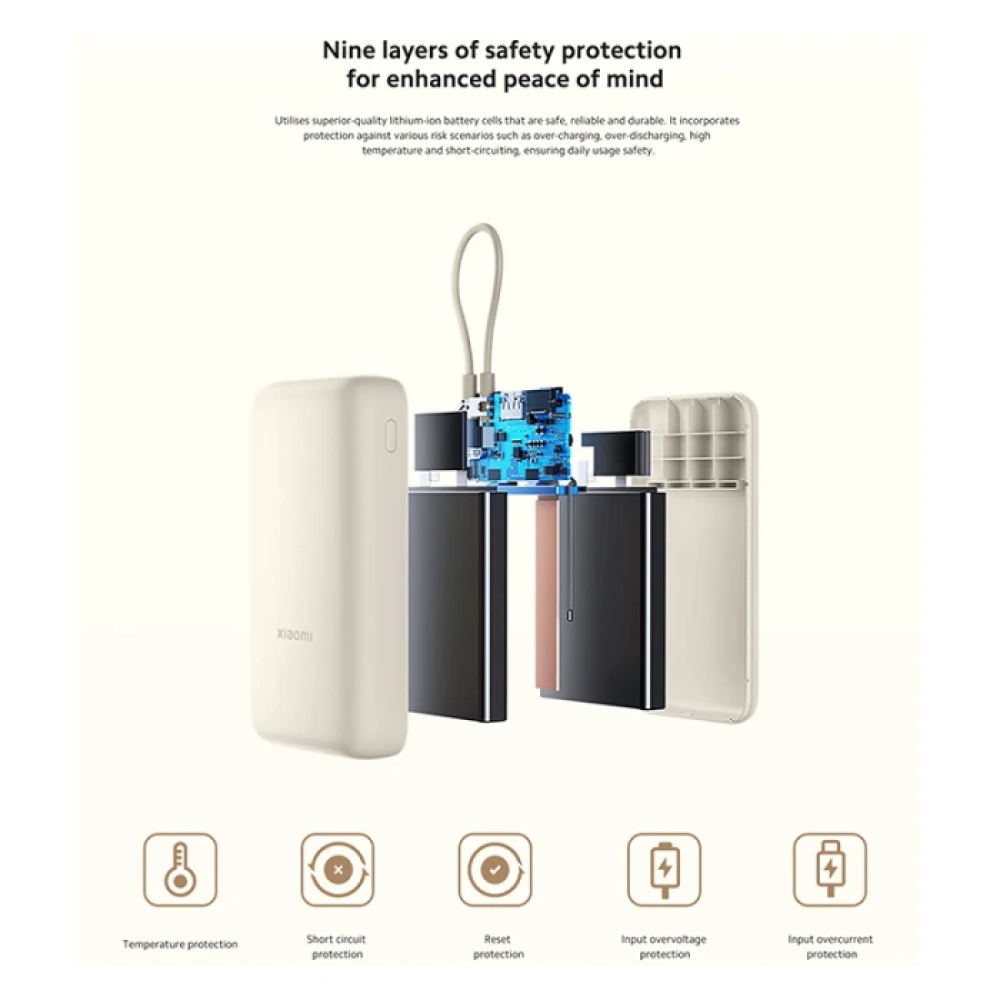 شاحن متنقل Xiaomi Power Bank Integrated Cable 20000mAh 33W (برقم الطراز BHR8851GL) هو جهاز ذو سعة كبيرة يتميز بقدرة شحن قوية وكابل مدمج لسهولة الاستخدام.